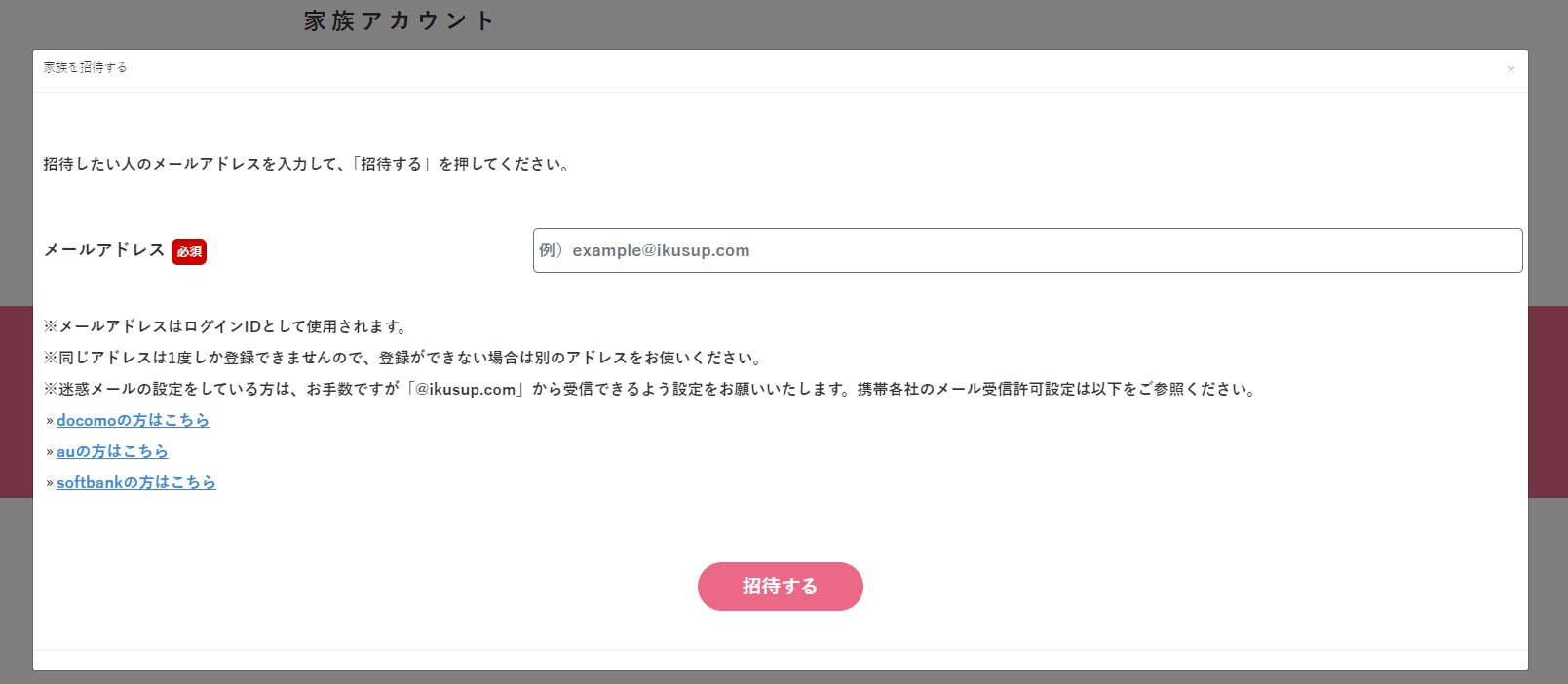 家族アカウントで登録するメールアドレスを入力し[招待する]をタップする。