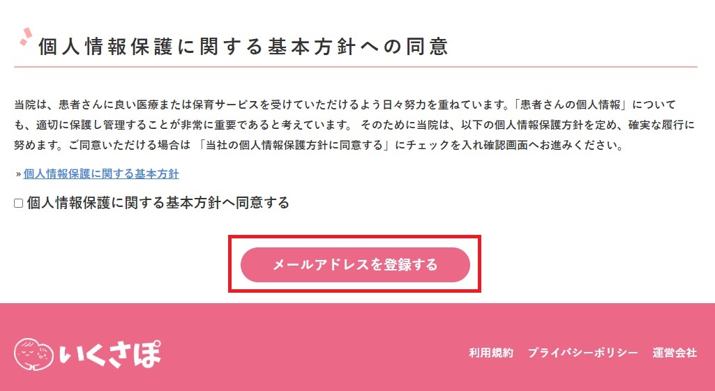 [個人情報保護に関する基本方針]をお読みいただき、[個人情報保護に関する基本方針へ同意する]をチェックした後[メールアドレスを登録する]をタップします。
